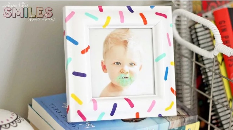 If you have extra sprinkle stickers from the donut balloon DIY, use them to decorate a picture frame or a wooden letter! This easy craft is perfect for adding a custom touch with a picture of the birthday boy or girl or the first letter in their name.